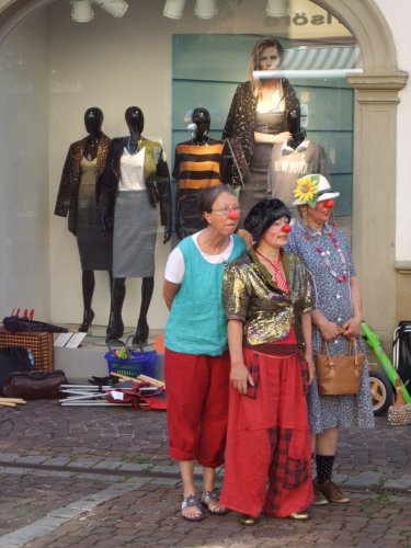 "Du musst keine gute Figur abgeben!" Das ist ein Leitsatz in der Clownerie. Wenn andere fragen: "Wie sehe ich aus?", staunt die Clownin darüber, was sie zu sehen         kriegt. Dabei beachtet sie weniger den neuesten Modetrend, die schlankeste Taille, das lässigste Outfit. Sie sieht eher, wie jemand daher kommt, wie aufmerksam das andere Augenpaar ist, ob jemand einen Verband hat oder so. Selbst hat sie ja auch so allerlei. Rücken oder Knie oder Verwirrtheit oder Verträumtheit. Trotzdem fühlt sich das ganz schön frei an, nicht perfekt eben und nicht einmal auf der Suche nach der bestmöglichen Perfektion. Aber schön bunt sind sie, nicht wahr, diese Drei?