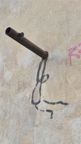 Ein Rohr guckt überflüssig aus der Wand und jemand sieht darin ein Turngerät. Nein, eher ein Spielgerät. Das Grafitti sieht nicht wie eine Einladung zum Sport aus, die Figur übt keinen Aufschwung. Ich sehe es als eine Einladung zum Spielen, zum Schwingen, zum Tanzen mit den Beinen in der Luft. Was für ein kreativer Blick! Erst einmal muss man ja so ein Rohr zur Kenntnis nehmen. Dann es als Anregung für etwas ganz Anderes wahrnehmen. Und schließlich auch noch über die Kunst verfügen, mit Stift oder Sprühflasche zu zeichnen. Ein kleines öffentliches Kunstwerk, so im Vorübergehen zu sehen. Bei mir hat es Schmunzeln ausgelöst, auch Verwunderung und Bewunderung. Und eben: Eine Einladung, es dieser Figur nachzumachen.