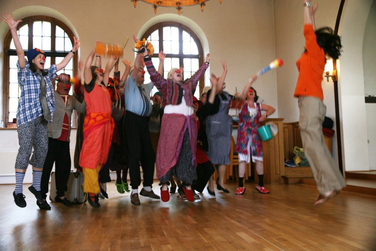 Bis es zu solchen "Hochsprüngen" kommt, braucht man schon etwas Übung, auch wenn Clownerie gerade darin besteht, keine gute Figur abzugeben. Die Langzeitfortbildungen finden in jedem Jahr in einer anderen Region Deutschlands und in Kooperation mit landeskirchlichen Einrichtungen - auch im Bildungshaus St.Virgil Salzburg und in der Schweiz - statt. Sie umfassen ca. 25 Kurstage mit verlängerten Wochenenden und einer Kurswoche. Einzelne Inhalte werden von weiteren Referent*innen vertieft. Die künstlerische und theologische Leitung liegt bei Gisela Matthiae.